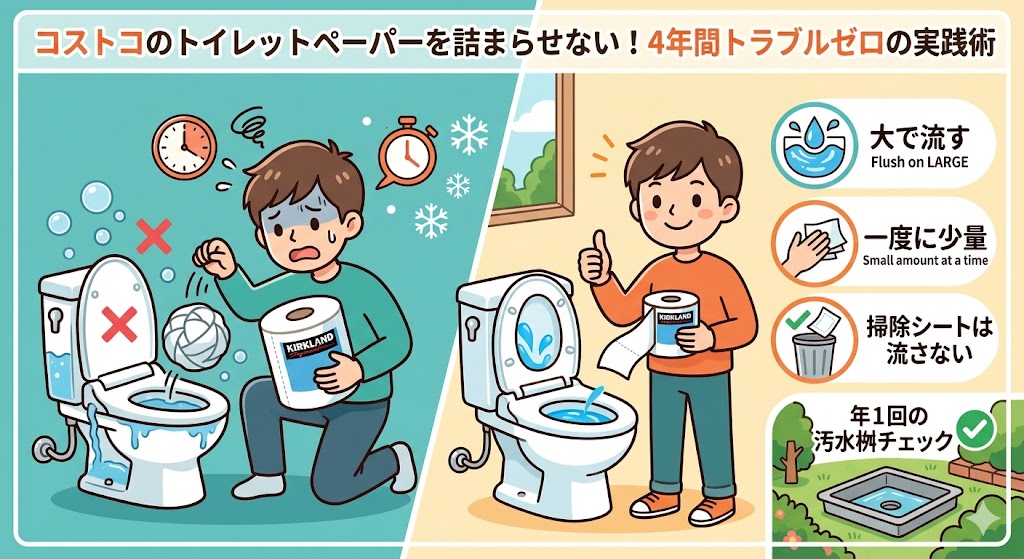 4年前は「もうコストコのトイレットペーパーはやめようか」と検討していたこともありました。 でも、適切なルールさえ守れば、アラウーノなどの節水型トイレでも快適に使い続けられます。